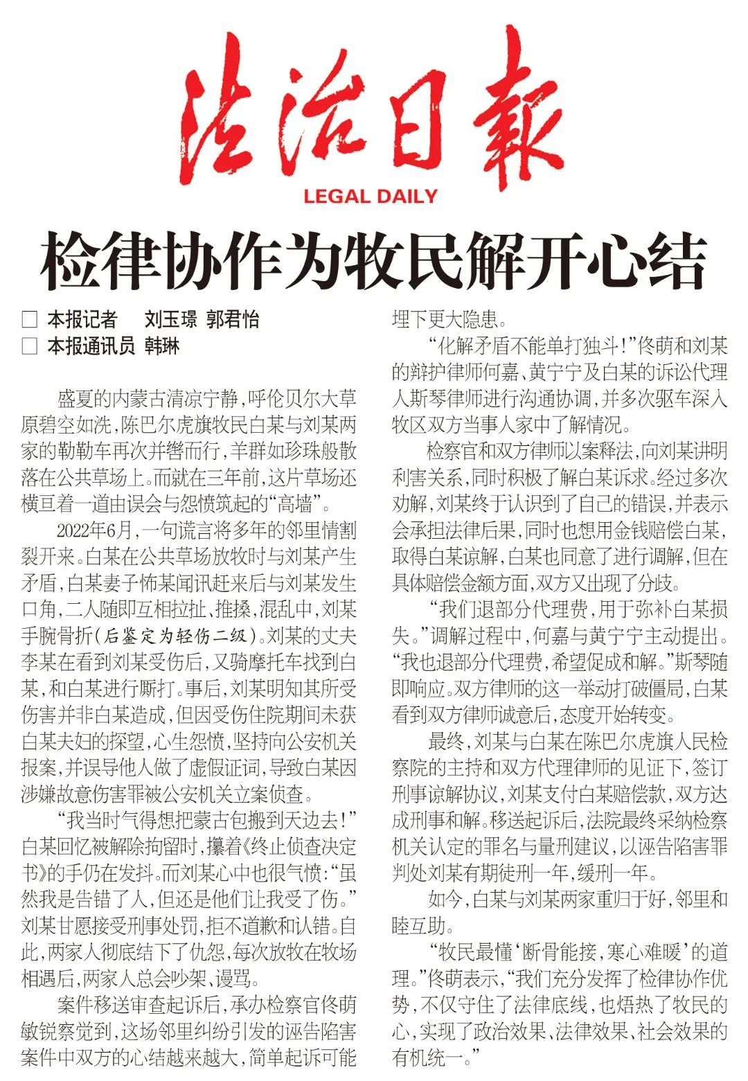 “牧民最懂‘断骨能接,寒心难暖’的道理。”佟萌表示,“我们充分发挥了检律协作优势,不仅守住了法律底线,也焐热了牧民的心,实现了政治效果、法律效果、社会效果的有机统一。”