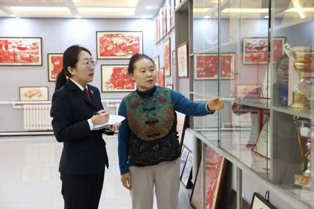 2025年12月,都叶梅向前来走访的内蒙古自治区扎兰屯市检察院检察人员介绍剪纸作品创作历程。