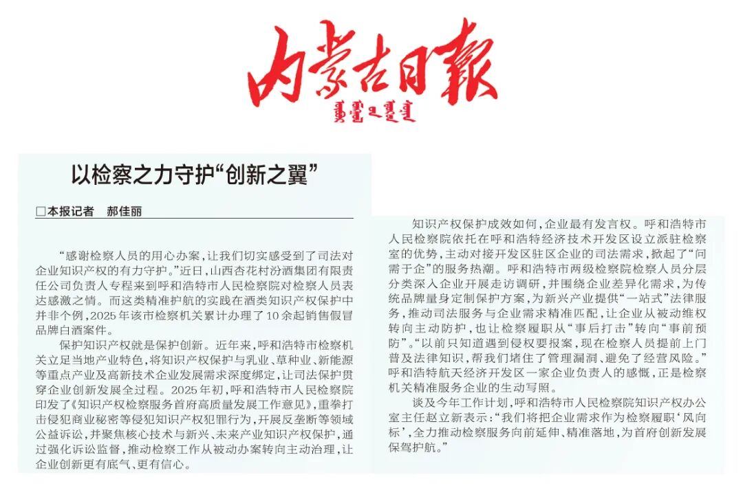 “感谢检察人员的用心办案,让我们切实感受到了司法对企业知识产权的有力守护。”近日,山西杏花村汾酒集团有限责任公司负责人专程来到呼和浩特市检察院对检察人员表达感激之情。而这类精准护航的实践在酒类知识产权保护中并非个例,2025年该市检察机关累计办理了10余起销售假冒品牌白酒案件。